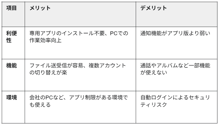 特にビジネスシーンでは、PCで作業をしながらスムーズに返信を行ったり、ファイルの送受信を効率化したりと、ブラウザ版ならではのメリットが数多く存在します。