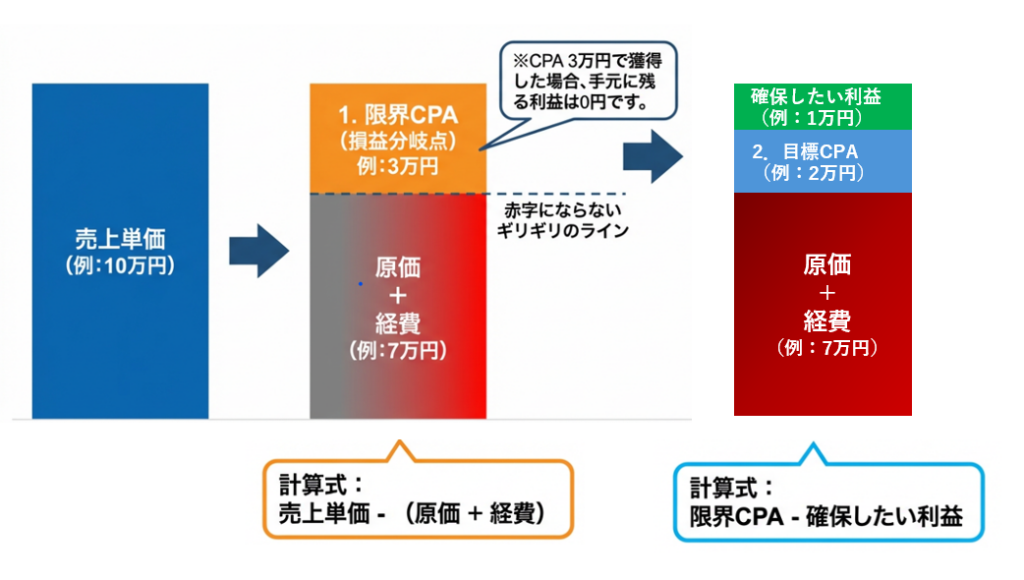 目標CPAの上限(これ以上は設定できないライン)を見極める際は、まず「赤字にならないギリギリのライン許容CPA(または限界CPA)」を把握し、そこから「確保したい利益」を考慮して「目標CPA」を設定します。