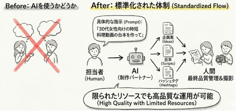 担当者が取り組むべきは、AIへの指示出し(プロンプトエンジニアリング)のスキルアップです。例えば「30代女性向けの時短料理動画の台本を作って」といった具体的な指示を出し、AIに大量の案を出させ、人間がそれを編集するフローを確立することで、限られたリソースでも高品質な運用が可能になります。