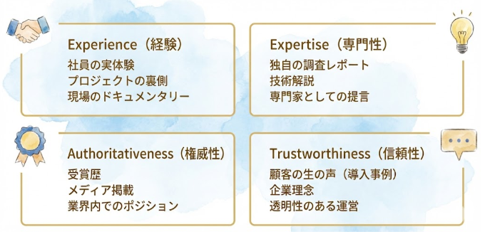 これらの一次情報は、Googleが提唱するE-E-A-T(経験、専門性、権威性、信頼性)を高める上でも極めて重要であり、AIがサイトを「信頼できる情報源」と判断するための強力なシグナルとなります。