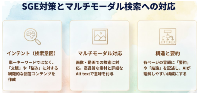 画像や動画での検索(マルチモーダル検索)が一般化することを見据え、Webサイトに質の高い画像や動画を戦略的に配置し、適切な代替テキストや説明文を付与することが重要になります。